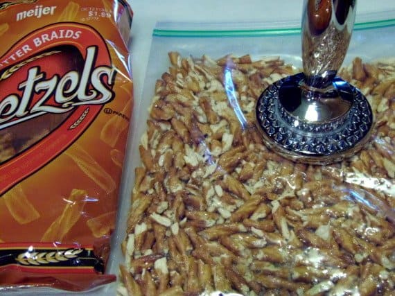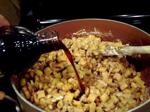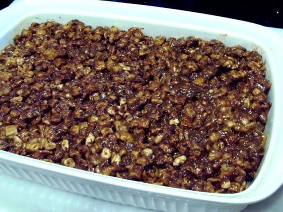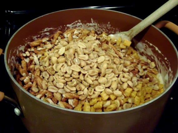 -Lower the heat to low and stir in the cereal, crushed pretzels, and peanuts.