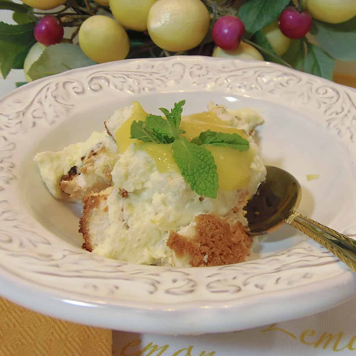 - -Use a serrated knife to gently cut the cake into bite-sized pieces and place them on a parchment-lined baking sheet.-Bake the cake cubes until they are just starting to brown, being careful not to burn them (approximately 7 minutes). This step is optional. -Using a clear serving bowl (or even dessert goblets), layer the golden cake pieces and the lemon curd whipped cream in as many layers as possible, ending with the lemon curd whipped cream on top.-Refrigerate until ready to serve and garnish with a sprig of the mint or some pretty lemon slices.