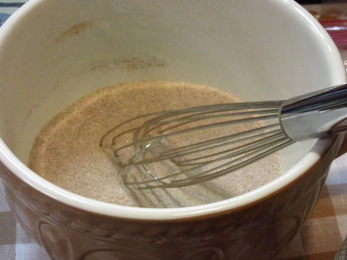 - In a medium bowl, whisk together the sugar and cinnamon. Set aside.