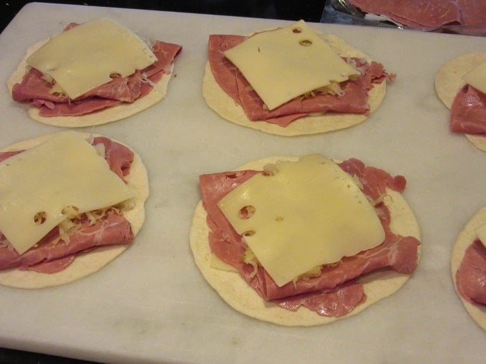 - Top 6 flour tortillas with Swiss cheese slices, corned beef, and drained sauerkraut.