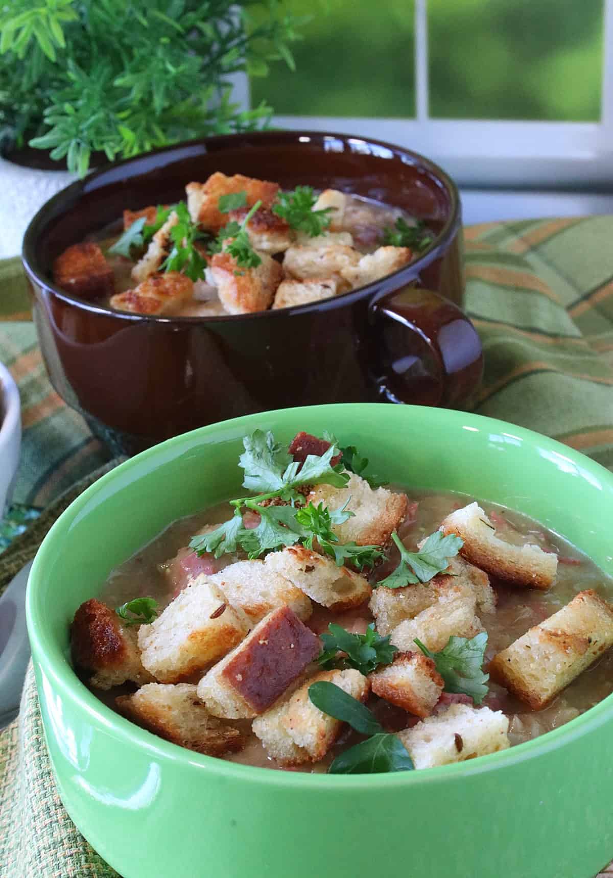 - Ladle the soup into bowls and top with the crispy rye croutons right before serving. Garnish with chopped parsley, if desired.