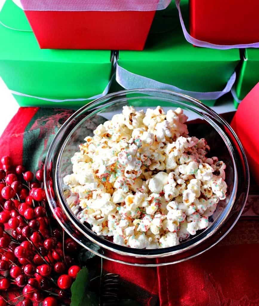 - *Note - this white chocolate popcorn is also wonderful for Hanukkah by swapping out the red and green sugar with blue sanding sugar.