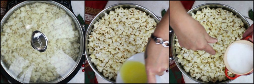 - Pour 4 tablespoons of melted butter over the popped corn along with 2 teaspoons kosher salt.