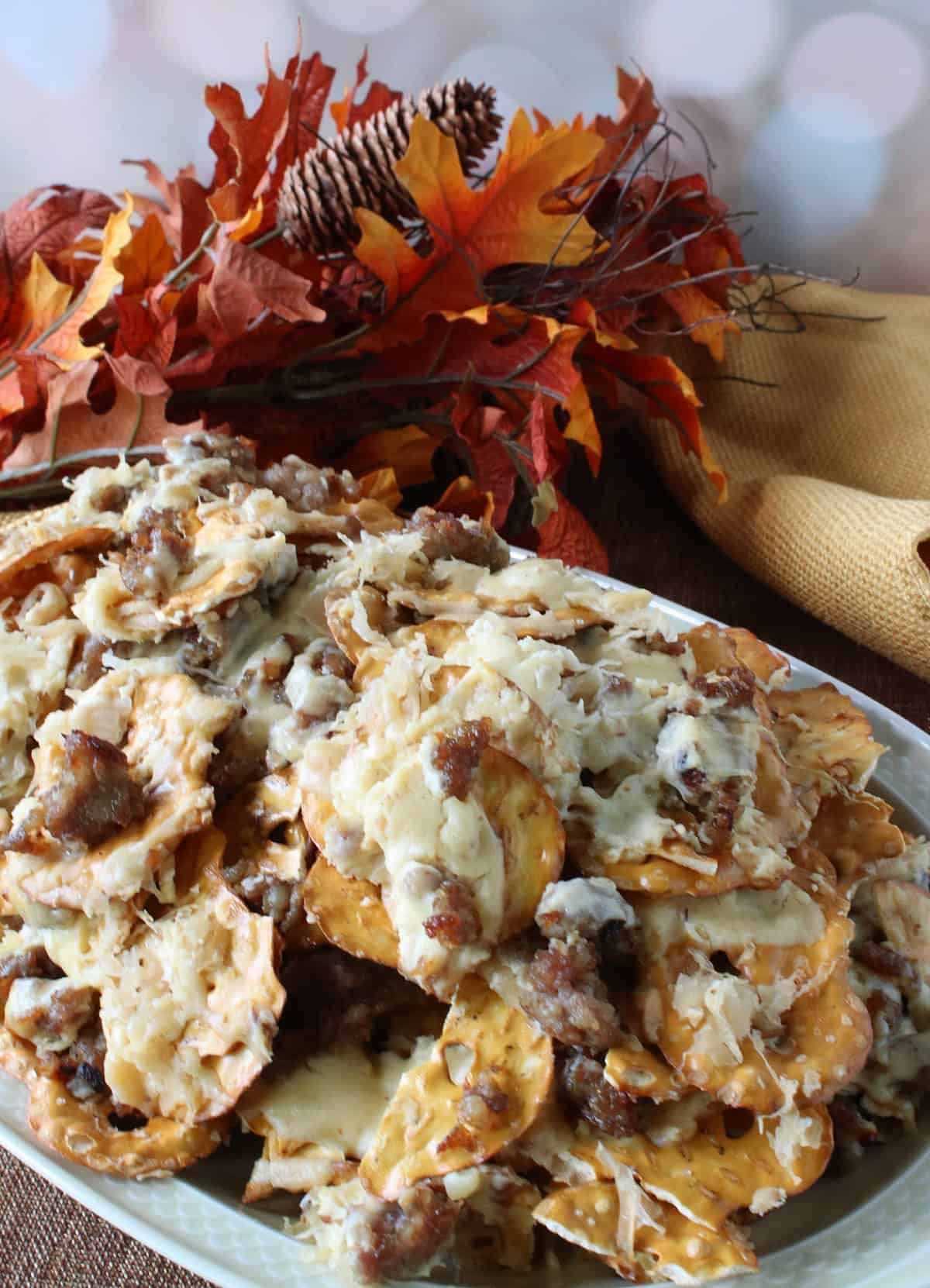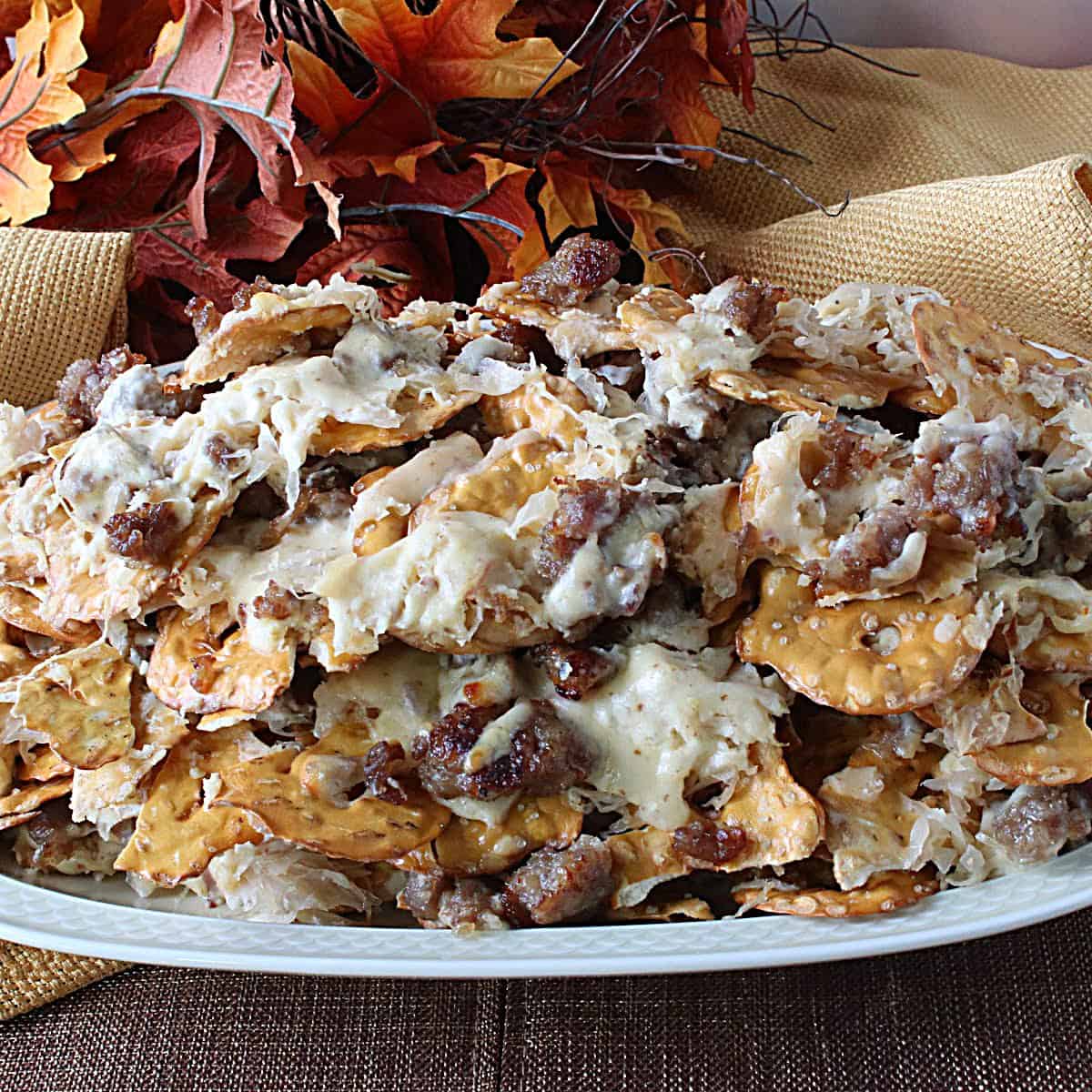 German-Style Pretzel Chip Nachos with bratwurst and beer cheese are a delicious, crunchy, cheesy, meaty treat that can be served as an appetizer or main course!