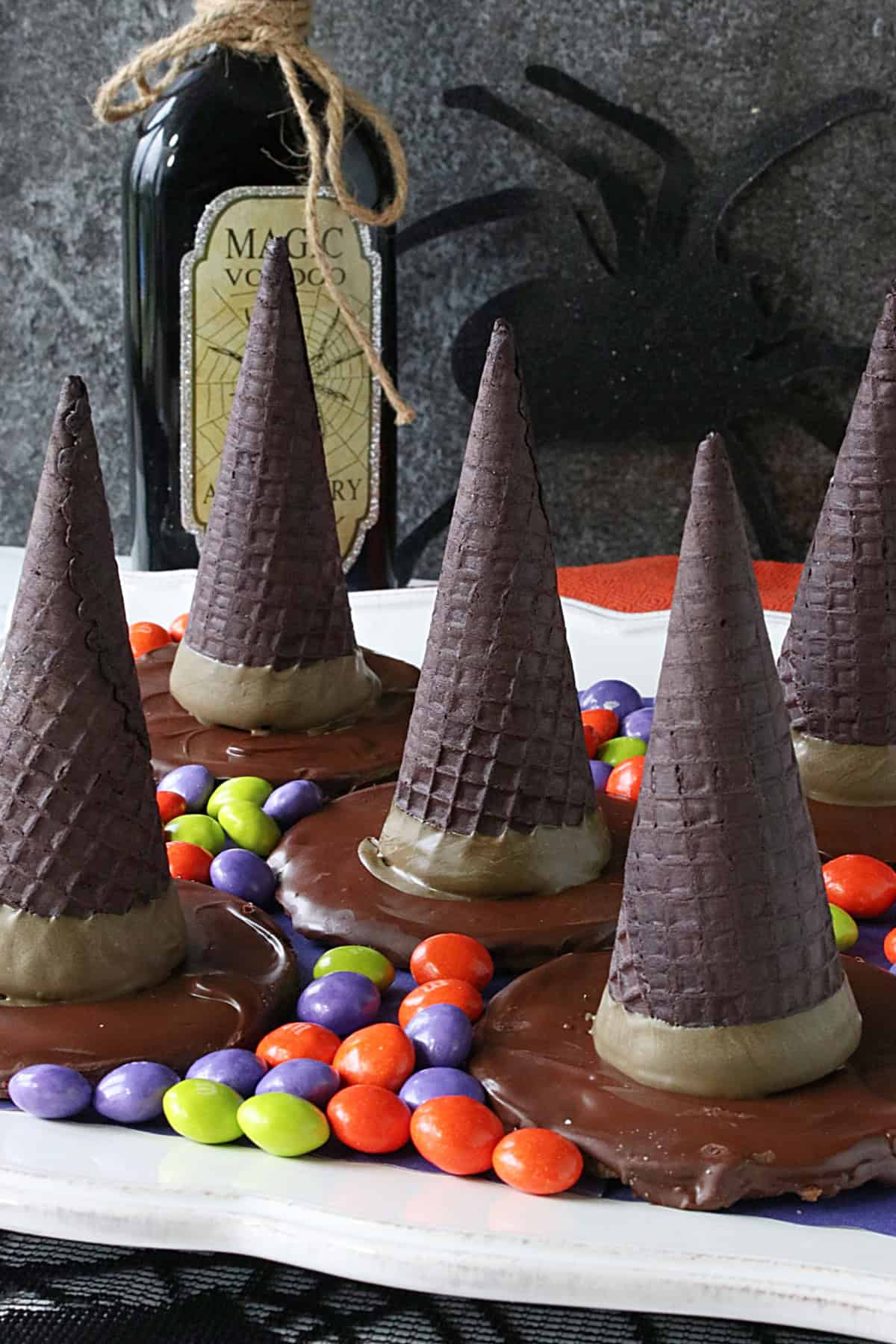 At first, I thought I'd have to cover standard sugar cones with melted chocolate to achieve the black hat effect I was after, but with using Oreo sugar cones, these treats became so much neater and quicker than anticipated. YAY!!