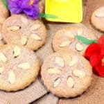 Place 5-6 almond slices (in a star pattern) on the top of each cookie and liberally sprinkle each cookie with the cinnamon and sugar mixture.
